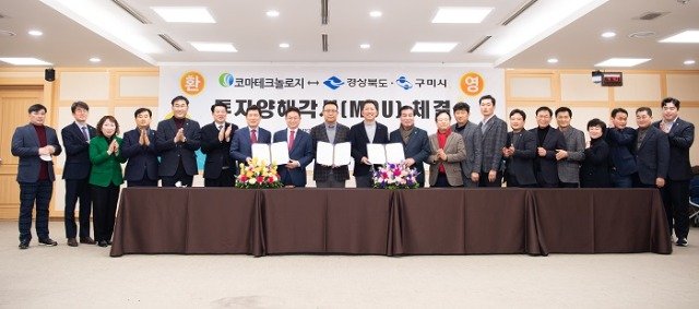 (전국= KTN) 김도형 기자= 구미시(시장 김장호)는 1. 18.(수) 16:00 구미시청 상황실에서 경상북도 이철우 지사, 코마테크놀로지 박성훈 대표, 구자근․김영식 국회의원 및 시․도의원, 기관단체장이 참석한 가운데 코마테크놀로지의 반도체 공정 소모성 부품분야 제2공장에 대한 투자양해각서(MOU) 체결식을 개최하였다.