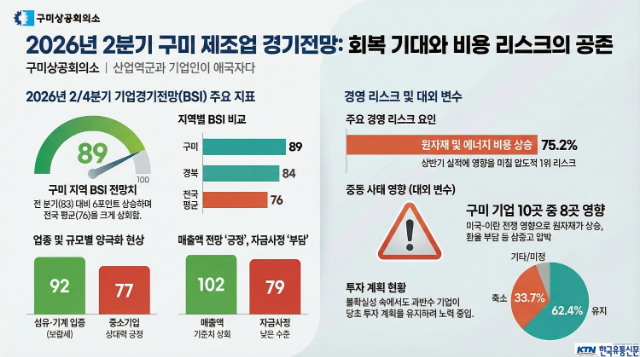 [한국유통신문= 김도형 기자] 구미상공회의소가 지역 내 101개 제조업체를 대상으로 실시한 '2026년 2/4분기 기업경기전망 조사' 결과, 2분기 기업경기실사지수(BSI) 전망치는 89를 기록해 전 분기(83) 대비 6포인트 상승한 것으로 나타났다. 지수가 다소 회복세를 보였음에도 불구하고 기준치(100)를 밑돌고 있어, 여전히 다음 분기 경기를 부정적으로 전망하는 기업이 더 많은 상황이다.