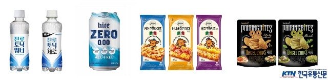 ▲ 이미지(왼쪽부터): 하이트진로음료 ‘진로토닉워터’, ‘진로토닉워터 제로’, ‘하이트제로0.00’, CJ 제일제당 ‘고메 1인용 사각피자’, 삼양식품 ‘페어링바이츠 베이글칩’