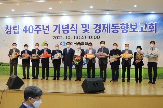 (전국= KTN) 김도형 기자= 구미상공회의소(회장 : 윤재호)는 10월 13일(수) 10:00 본 회의소 2층 대강당에서 윤재호 회장, 장세용 구미시장, 구자근․김영식 국회의원, 김재상 구미시의회의장을 비롯한 기관단체장, 도·시의원, 회원사 대표 및 임직원 등이 참석한 가운데『구미상공회의소 창립 40주년 기념식 및 경제동향보고회』를 개최하였다.