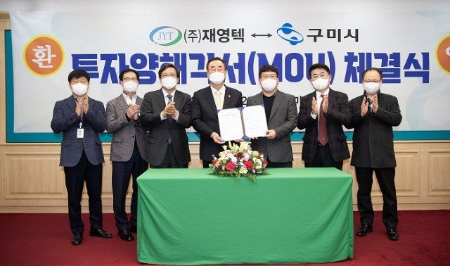 (전국= KTN) 김도형 기자= 구미시는 2021. 12. 28.(화) 16:00 시청 국제통상협력실에서 장세용 구미시장, ㈜재영텍 박재호 대표, 지역 기관단체장 등이 참석한 가운데 ㈜재영텍과‘리튬이온전지 양극재용 소재 물질’생산 투자를 위한 양해각서(MOU)를 체결하였다.