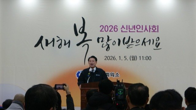 【한국유통신문=구미】윤재호 구미상공회의소 회장은 1월 5일 구미상공회의소 대회의실에서 열린 ‘2026년 구미지역 신년인사회’에서 참석자들의 큰 박수를 받으며 힘찬 새해 메시지를 전했다. 윤 회장은 지역 경제의 성과와 신공항 시대의 전략적 방향을 제시하며 “기업가정신으로 구미의 새로운 르네상스를 열겠다”고 강조했다.