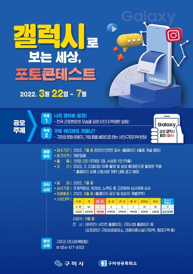 (전국= KTN) 김도형 기자= 구미상공회의소(회장:윤재호)와 구미시는 ‘기업 氣살리기 & 구미 홍보 프로젝트’ 첫 번째 사업으로 올해 3월부터 7월까지 ‘삼성 갤럭시 전국 사진 공모전(갤럭시로 보는 세상, 포토 콘테스트)’을 개최한다.