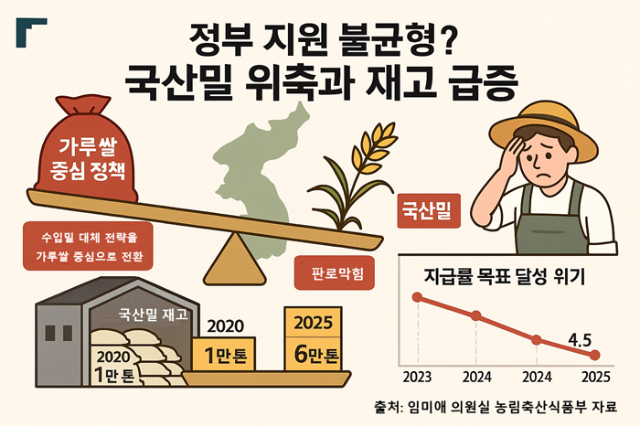 농식품부는 전략작물 소비 확대를 위해 ‘제품화 패키지 지원사업’을 운영 중이다. 그러나 국산밀에는 자부담 비율 50%(개소당 3억 원)를 적용한 반면, 가루쌀에는 20%(개소당 2억 원)만 부담하도록 해 편중 지원 논란이 일고 있다. 그 결과 농심·오뚜기·삼양·CJ푸드빌·SPC·신세계·파리크라상 등 대기업들이 가루쌀 사업에 대거 참여한 반면, 국산밀 사업은 영세 중소업체 위주로 제한됐다.