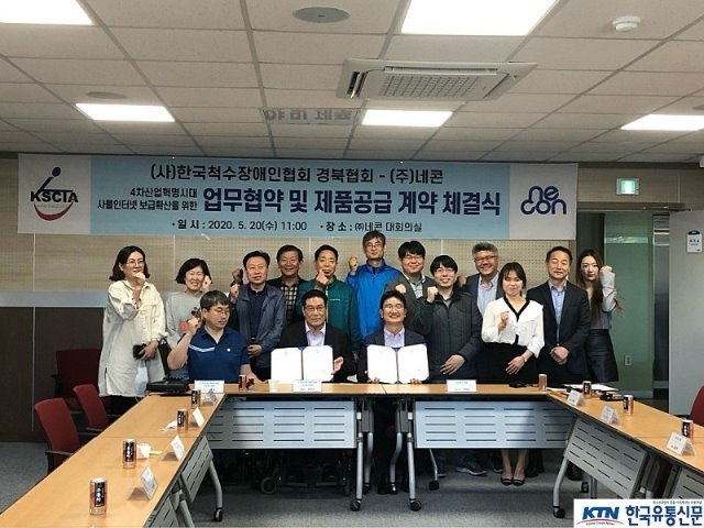 (전국= KTN) 김도형 기자= 사)한국척수장애인협회 경상북도협회(협회장 최영수)와 주식회사 네콘(대표 최정호)은 5월 20일(수) 11시 구미시 신평동 소재 3D프린팅제조혁신센터(구 금오공대) 3층 대회의실에서 IoT(사물인터넷) 서비스 지원사업 관련 IoT 패키지 상품관 컨텐츠의 공급에 따른 A/S 등에 대해 업무협약(MOU)을 체결하고 척수장애인의 편의성 증진은 물론, 삶의 질 향상을 위해 상호 신뢰와 우호 협력 관계를 강화하기로 했다.