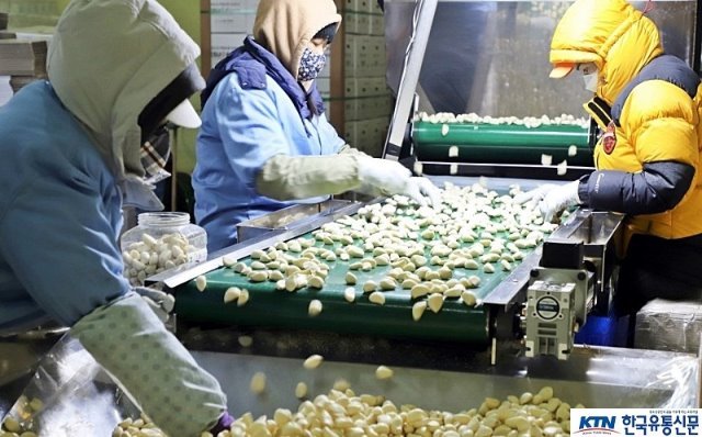 냉장창고에서 수출용 깐마늘을 선별하는 현장사진