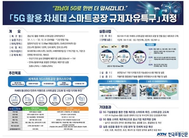 넓고 복잡 다양한 공장 내 실증을 위해서는 다수의 통신단말기가 필요하고, 많은 양의 데이터를 원활하게 전송할 수 없어 전파출력과 무선기기 전력밀도를 4배로 상향함으로써, 다양한 5세대(5G) 스마트공장 시범 서비스를 실증할 수 있는 규제자유특구로 지정 받았다.