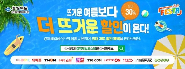 (전국= KTN) 김도형 기자= 경상북도는 지역 우수 제품 소비 촉진을 위해 경북세일페스타 여름맞이 기획전 및 프로모션 행사를 7월에 대대적으로 실시한다고 밝혔다.