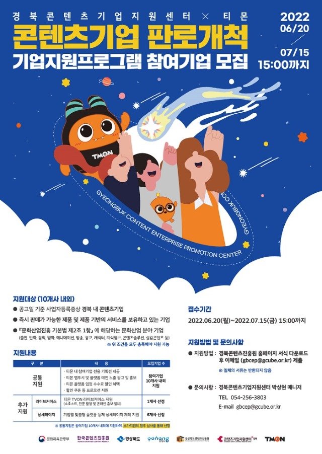 (전국= KTN) 김도형 기자= 경상북도콘텐츠진흥원(이하 진흥원) 경북콘텐츠기업지원센터는 ㈜티몬과 함께 도내 콘텐츠 기업의 온라인 판매 역량 강화를 위한 판로개척 지원에 나선다.