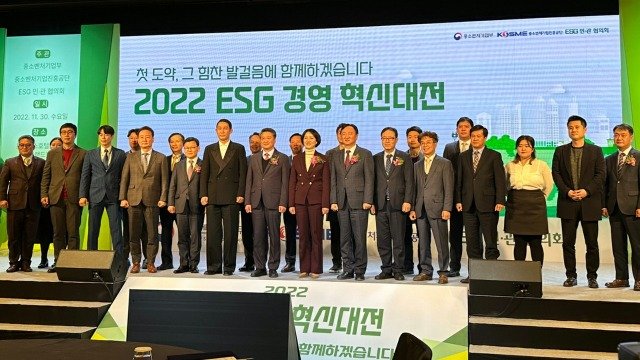 지난 30일 포시즌스호텔 서울 그랜드볼룸에서 열린 행사에는 중소벤처기업부 이영 장관, 중소벤처기업진흥공단 김학도 이사장, 중소기업중앙회 정윤모 상근부회장, 주요 은행장 등 약 100여 명이 참석했다. 중소기업 우수 ESG 혁신사례 포상, 금융기관 업무협약, 중소기업 ESG 고도화방안 발표 등 중소기업 ESG를 위한 활발한 행사가 치러졌다.