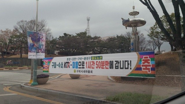 구미시청 앞 구미시 KTX 이음 유치 가능성을 알리는 축하 현수막 전경