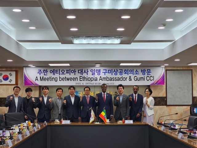 (경북= KTN) 전옥선 기자= 구미상공회의소(회장 : 윤재호)는 6월 29일(목) 10:30, 구미상공회의소 3층 회의실에서 김달호 사무국장을 비롯한 상의 관계자, 데시 달케 두카모 에티오피아 대사 일행, 권세영 코트라 구미분소장이 참석한 가운데 “에티오피아 대사 일행 구미상의 방문 경제교류 간담회”를 개최하였다.