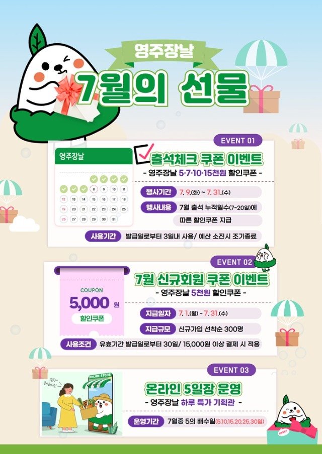 또한 영주장날 쇼핑몰 상반기 매출액 31억 원 달성을 기념해 5일마다(5일, 10일, 15일, 20일, 25일, 30일) 할인된 가격을 제공하는 ‘온라인 5일장’ 기획전 및 7월 영주장날 신규회원 300명에게 1만 5천 원 이상 주문 시 사용 가능한 5천 원 할인쿠폰을 지급하는 이벤트도 진행된다.