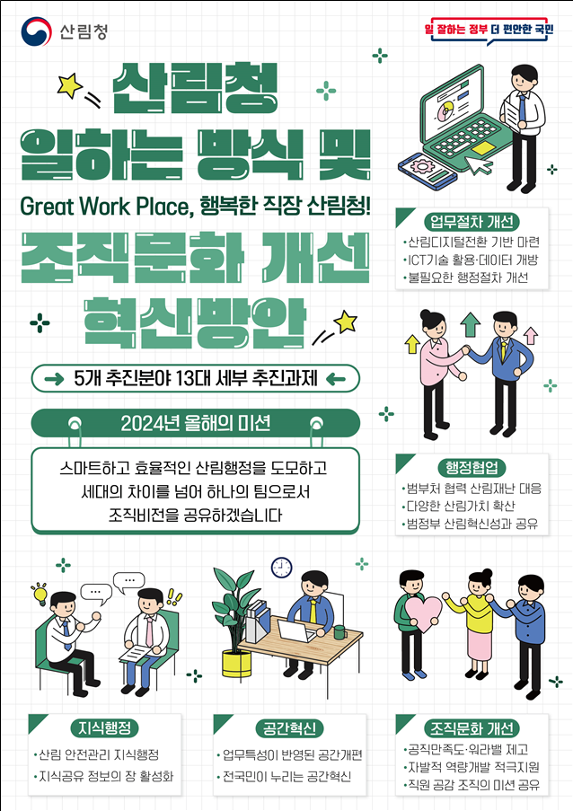 제35대 임상섭 산림청장은 지난 7월 취임사에서 세대 차이를 넘어 모든 구성원이 하나의 팀으로 화합해 일할 수 있는 산림청을 만들겠다는 의지를 밝힌 바 있다. 이러한 비전을 바탕으로 산림청은 △업무 절차 개선 △행정 협업 △지식행정 △공간 혁신 △조직 문화 개선 등 5개 분야에서 13가지의 세부 과제를 설정했다.