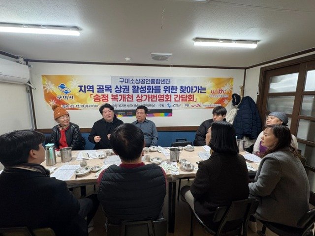 [한국유통신문= 김도형 기자] 구미상공회의소(회장 윤재호) 구미소상공인종합센터(센터장 김성학)는 12월 10일 오전 11시, 구미 송정동 복개천 상가 일원에서 ‘2025년 구미시 지역 골목상권 활성화를 위한 구미 송정 복개천 상가번영회 간담회’를 개최했다.
