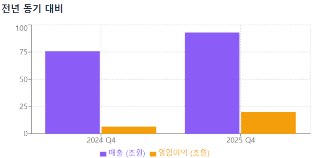 8일 삼성전자는 연결 기준으로 2025년 4분기 매출 93조 원, 영업이익 20조 원의 잠정 실적을 기록했다고 공시했다. 이는 전기 대비 매출 8.06%, 영업이익 64.34% 증가한 수치이며, 전년 동기와 비교하면 매출은 22.71%, 영업이익은 무려 208.17% 증가했다.