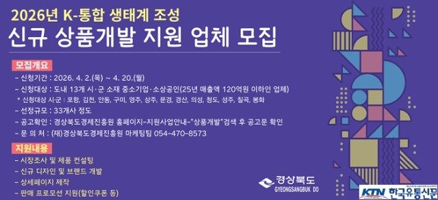 [한국유통신문= 김도형 기자] 경상북도가 도내 유망 중소기업과 소상공인의 제품 경쟁력 강화를 위해 ‘2026년 K-통합 마케팅 생태계 조성사업’의 일환으로 ‘신규 상품개발 지원사업’ 참여 기업을 모집한다. 이번 사업은 상품 기획 단계부터 디자인, 마케팅까지 전 과정을 아우르는 종합 지원 프로그램으로, 도내 기업의 시장 경쟁력 제고를 목표로 하고 있다.